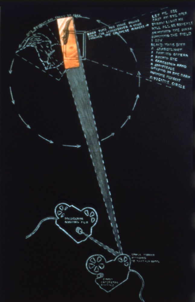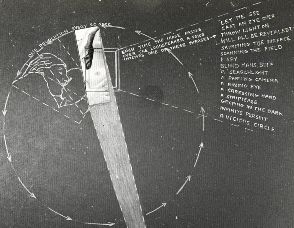 A soft core porn film is projected via a narrow mirror mounted on a slowly revolving film spool on another empty projector.