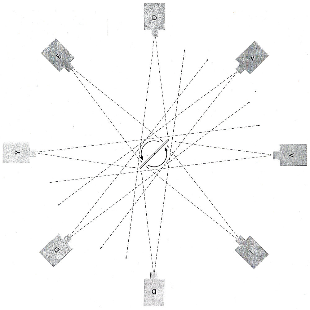 Eight loops of film, each showing the artist signing one letter of his name, are projected towards a small revolving screen.
