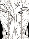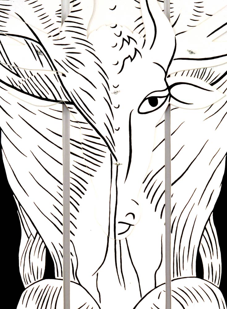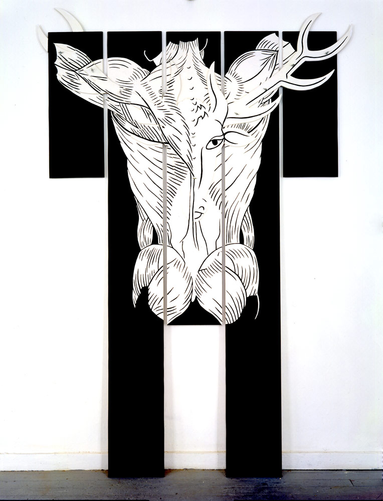 Tattoo1986 more information Goldsmiths MA Show Painted wood, nuts and bolts. The central head section is bolted to and supported by the planks leaning against the wall