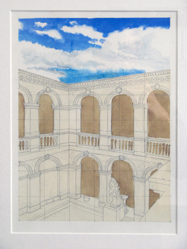 This work imagined the central hall as it was first envisaged by William Scott Bell: without a roof and before the pre-raphaelite images were painted on the walls.