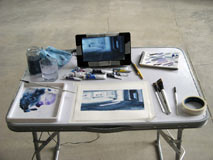 The painting table was exhibited alongside the paintings.